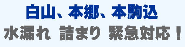白山、本郷、本駒込での水の困った即解決!急な水道トラブルに緊急でかけつけ訪問し、蛇口の水漏れ、トイレ詰まり、排水の溢れ、タンクの故障など修理いたします。